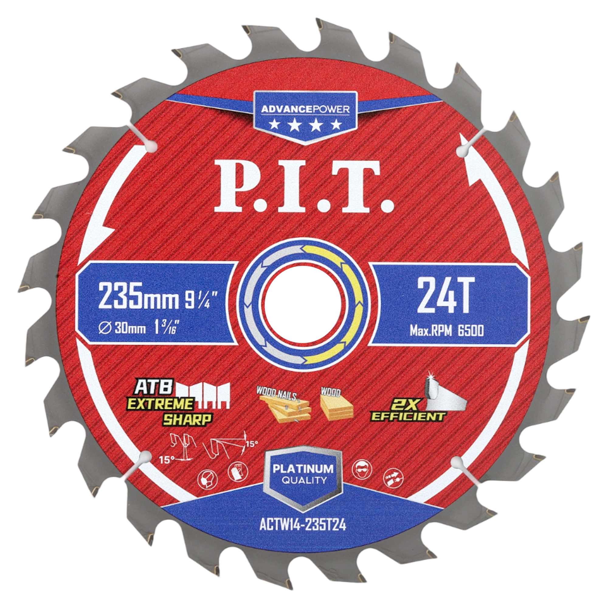 - Диск пильный по дереву P.I.T. ADVANCE 235x30x1,8 мм, 24T Carbide, зуб ATB 15° (ACTW14-235T24), быстрый рез